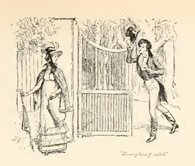 In this image Mr. Darcy calls on Elizabeth while she was out for a walk. The day after she rejected him, Mr. Darcy met her while she was out on a walk. He handed her a letter explaining her charges of his misconduct regarding Jane and Mr. Bingley’s relationship, and Mr. Wickham. He wrote that he knew Mr. Bingley loved Jane but he did not believe Jane reciprocated his love. He then suggested Mr. Bingley leave Netherfield to avoid getting hurt. Regarding Mr. Wickham, he writes that Mr. Wickham tried to swindle him out of his late father’s inheritance, and when that failed, he tried to marry Mr. Darcy’s sister, Georgiana, to gain access to her inheritance. This scene occurs in chapter 35. The characters are shown in the traditional regency style. Elizabeth wears the regency style dress with an empire waistline. She wears a cloak and bonnet and carries a parasol. Mr. Darcy wears a waistcoat and tailcoat with breeches. He raises his top hat and holds the letter in his hand. The regency period dated to the early nineteenth century (1811-1820) when George, Prince of Wales, later George IV (r. 1820-1830), reigned as regent for his mentally ill father, King George III (r. 1760-1820). The regency period is associated with the rise of neoclassicism in art and fashion.