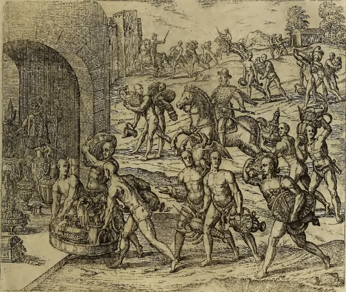 Inca Emperor Atahualpa (Atabalipa) agreed to pay the ransom amount demanded by Francisco Pizarro to secure his freedom. Inca men stream towards the walls of the city Cajamarca bearing gold and silver items, including plates, vases, chests of jewelry, carvings of mythical creatures, and other pieces they have gathered throughout Peru. The Inca people are supervised by several Spaniards on horseback wielding wooden clubs or truncheons.
