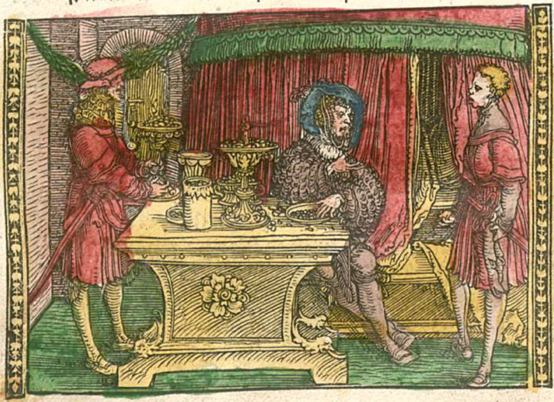After spending the night with Areusa, Pármeno (rightmost figure) wakes to find that it is already noon. Areusa asks him to stay and talk, but he explains that his master Calisto will already be upset with his lateness. He proposes that they have dinner with Celestina, Elicia, and Sempronio that night, and she happily agrees. When he returns to Calisto’s house, he is met by Sempronio (leftmost figure), who chides him for his lateness. Pármeno explains his new love for Areusa, and Sempronio immediately infers that Pármeno is now working to scam Calisto with him and Celestina. They decide to check on Calisto (central figure) in his bedroom, and they find him in a state of despondency, talking to himself in verse. When he regains a semblance of sanity, he tells them that he is going to Saint Mary Magdalene’s Church to pray for a remedy to his situation.
