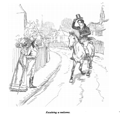 Here we see Edmund riding into Mansfield after being absent in Thornton Lacey raising his top hat to Mr. And Miss Crawford. Edmund was surprised to see them, as he thought that they would have left to go to London before he returned. This scene occurs in chapter 34. The characters are shown in the traditional regency style. Miss Crawford wears a regency style dress with an empire waist. Mr. Crawford and Edmund wear waistcoats and tailcoats with breeches and top hats. Mr. Crawford holds up his walking stick in greeting Edmund. The regency period dated to the early nineteenth century (1811-1820) when George, Prince of Wales, later George IV (r. 1820-1830), reigned as regent for his mentally ill father, King George III (r. 1760-1820). The regency period is associated with the rise of neoclassicism in art and fashion.