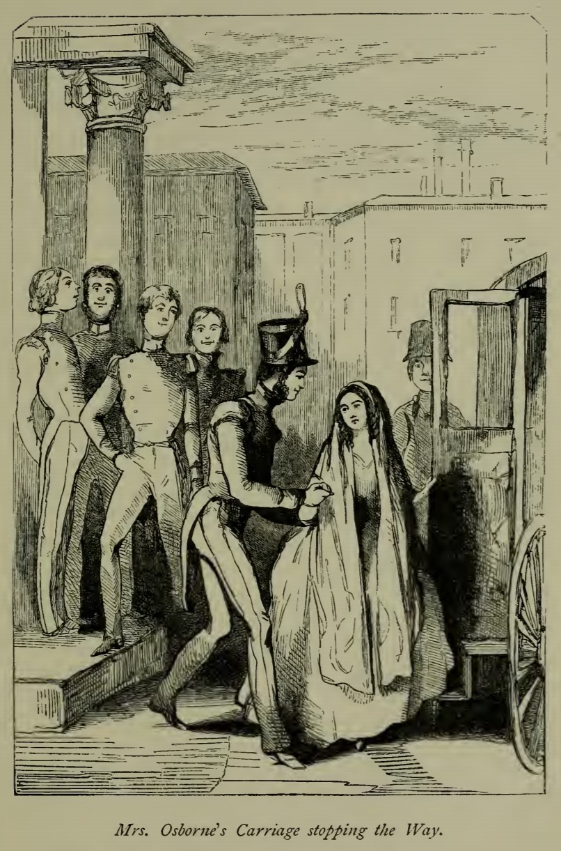 William Dobbin hands Amelia Osborne into her carriage as she leaves the ball. Behind the carriage door, the footman can be seen, and to the left of Dobbin, on the stair four young men are talking and smiling. In contrast to the others in the image, Amelia looks quite tired and sad. Below the illustration is printed its title, Mrs. Osborne’s Carriage stopping the Way.