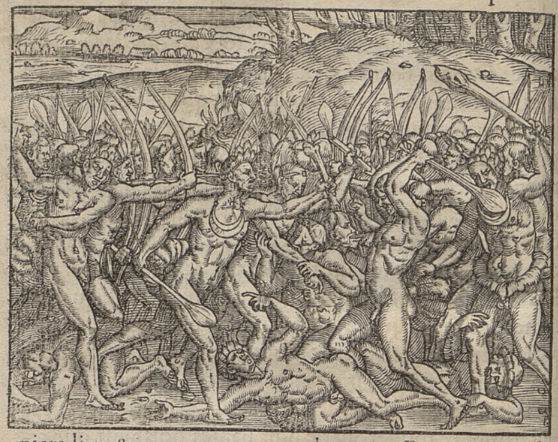 Two groups of Indigenous Brazilians engage in armed conflict. Members of both groups wield bows and arrows and clubs, and some bite members of the opposing group. Most of the men in both groups wear feathered headdresses and adornments around their waists, and some wear necklaces. Several men have fallen to the ground. This image is identical to one found in Paris, 1557.