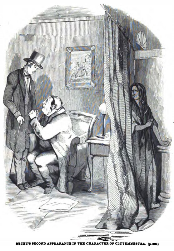 Joseph Sedley sits in a chair, begging William Dobbin, now his brother-in-law, to come and live near him, or else help him escape to India without Becky finding out. Behind a curtain on the far side of the room is Rebecca Crawley, listening in and holding a dagger in one hand. Below the illustration is printed its title and location in the story, BECKY’S SECOND APPEARANCE IN THE CHARACTER OF CLYTEMNESTRA. (p. 332.).