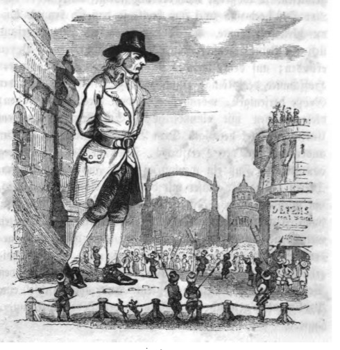 In this image we see Gulliver standing next to the Lilliputian Castle, surrounded by Lilliputians. Here we see the real height difference between Gulliver and the Lilliputians. Several Lilliputians hold swords, while others hold the ladders, they used to climb Gulliver while he was lying on the shore. Two dogs are in the foreground next to the fence. Others stand on the roof of the turret on the right side of the image. Gulliver looks down to the Lilliputians in conversation. The same image appears in the 1843 Krabbe edition.