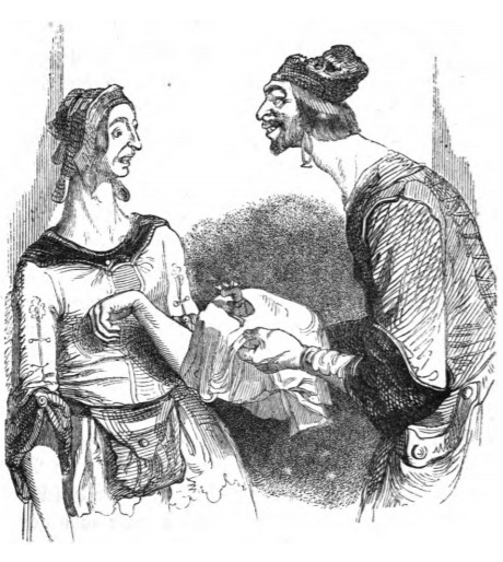 Here we see the farmer giant who discovered Gulliver presenting him to his wife. The farmer holds Gulliver on a cloth. Gulliver kneels on the cloth in front of the woman with his arms out towards her. The woman wears a dress with a pocket hanging in front of her. Her hair is covered with a cap. She looks surprised by Gulliver and holds her left arm close to her as though she is alarmed or put off by Gulliver. The same image appears in the 1839 Krabbe edition.