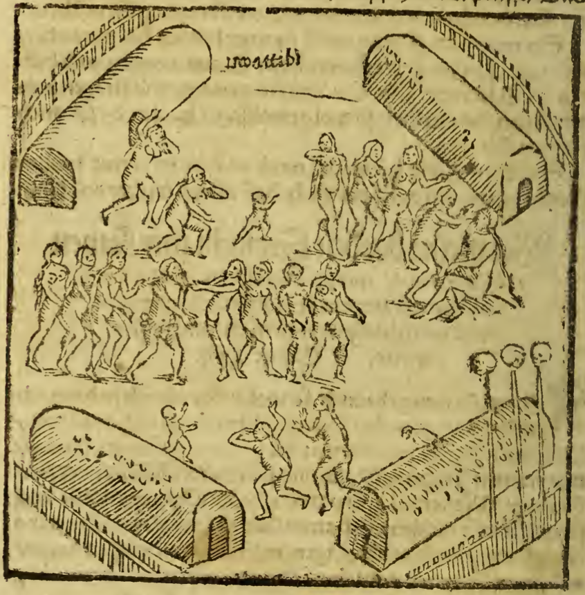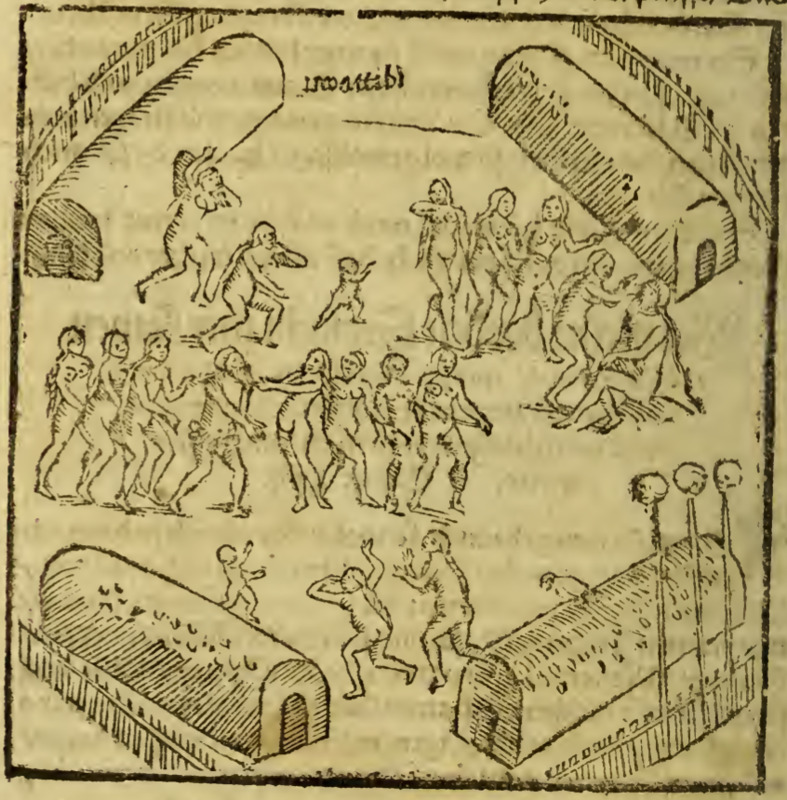 A small Tupinambá Indigenous village is shown. There is a fence around the perimeter, with four long structures inside. In the lower right corner, there are three long poles with skulls mounted on top of them. In the center of the village there is a group of Indigenous men, women and children. A bearded man sits on the ground on the right and is tended to by one of the Indigenous women.