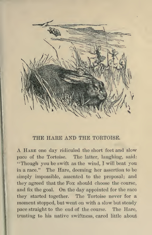 A large hare is lying in the grass in the fore ground. Its long ears are bent backwards, and its eyes are slightly closed, it looks as though the hare is sleeping. In the background, a tortoise is lounging on the sand near the shore, its little head looking in the direction of the sleeping hare.