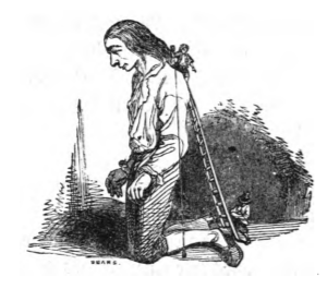 Here we see two Lilliputian tailors taking Gulliver’s measurements for new clothes. Gulliver is kneeling on the ground. One tailor stands on Gulliver’s shoulder and drops the weighted measuring tape down to the ground. A second tailor stands on the ground and records Gulliver’s measurements in a notepad. A tall ladder is leaning against Gulliver’s back. The same image appears in the 1839 Krabbe edition.