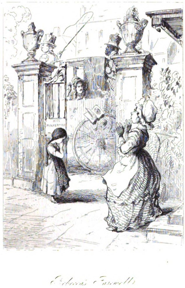 The image depicts two pillars topped with cups, between which is an open gate with a plate reading Miss Pinkerton. The pillars frame a carriage with very large wheels, at the front of which sits the coachman, holding his whip, and at the back of which stands Sambo. Rebecca Sharp’s face can be seen from the window of the carriage as she flings a book at the surprised Miss Jemima, who stands on the right side of the image at the bottom of the stairs and had just given the book to her. Next to the left pillar is a young girl with long braids, likely Laura Martin, crying and covering her face with her hands. Below the illustration is printed in cursive its title, Rebecca’s Farewell.c