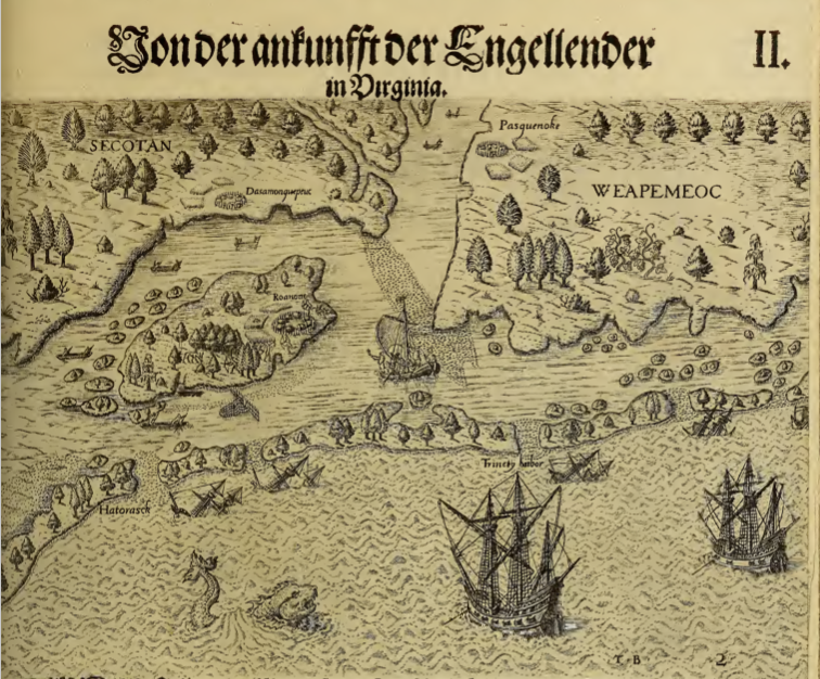 Two English ships are pictured sailing near the coast of Virginia (what is known today as the Outer Banks of North Carolina). One smaller ship is pictured within the outer islands, closer to the coast. Several Indigenous towns are labelled.