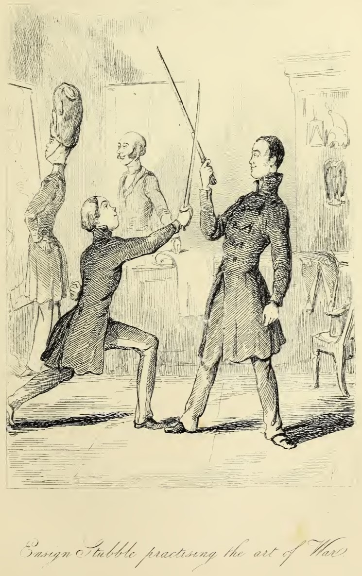 Tom Stubble holds up a new sword at the accoutrement-maker’s, lunging at the much taller William Dobbin, who parries with his bamboo walking-stick. Both men are smiling. In the background a store employee can be seen, along with a man trying on a tall guard’s hat. Below the illustration is printed in cursive its title, Ensign Stubble practising the art of War.