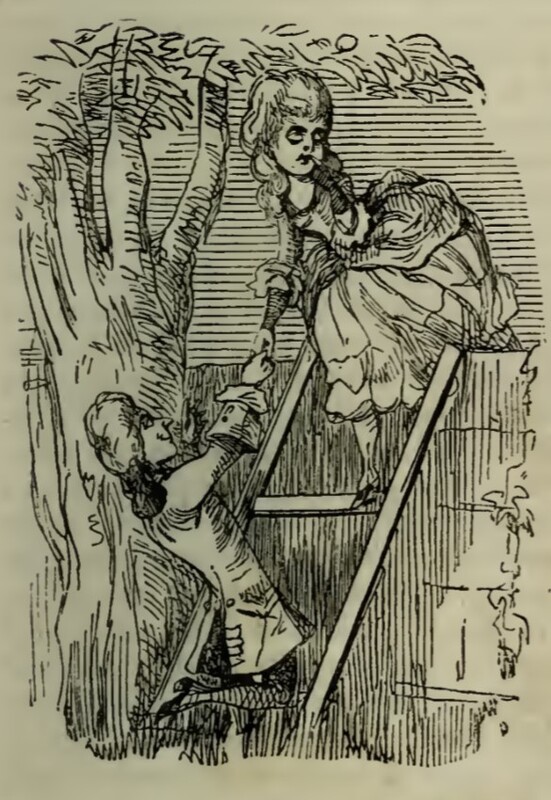 Two figures are climbing over a wall using a ladder placed next to a tree. The man, representing Captain Rawdon Crawley, is at the bottom of the ladder, holding the hand of the woman. She is Rebecca Sharp, who is looking backwards as she climbs over the wall and onto the ladder. The ladder forms the letter H from How.