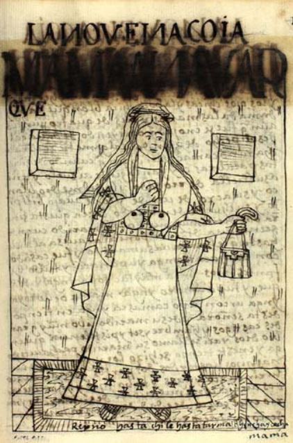 This illustration depicts Mama Anawarkhi, the ninth Coya [Queen] of the Inca Empire. She was married to Pachacuti Inca, the ninth king of the Inca Empire. She is depicted standing in the centre of the image wearing traditional garb with an embroidered belt and embroidery at the bottom of her skirt. The author explains that she was an obedient wife to her husband and died at the age of 80. The words Reynó hasta Chile, hasta Tarma, Chinchay Cocha are written at the bottom of the image which translates to He reigned to Chile, Tarma, Chinchayqucha. These are the regions that her and her husband reigned over.