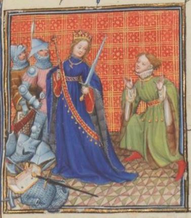 This illuminated image depicts Semiramis, an ancient queen of the Assyrians. She is depicted wearing clothing specific to the time of the creation of the image. She is depicted wearing a crown to signify her status as queen. After her husband (King Ninus) died, she decided to disguise herself as their son so that she could obtain power of the kingdom. She led her kingdom fearlessly and achieved great military success, which is why she is depicted holding a sword in the image. The boy on the right of the image is assumed to be her son, as they look alike in the face and hair colour.