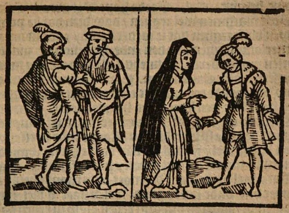 As Celestina informs Calisto of her meeting with Melibea, he cannot contain his emotions (they are seen talking to the right of the image). Pármeno repeatedly makes snide remarks under his breath, insulting both Celestina and Calisto. Sempronio overhears these remarks and grows angry with Pármeno (they can be seen to the left of the image), pointing out that his words are damaging to both Celestina and to Sempronio himself. To the right of the illustration, we can see Celestina wearing a robe and a veil. Calisto stands beside her, wearing a coat and a hat, with a sword mounted on his belt (it can be seen protruding from behind his coat in the bottom right corner). His hung head and facial expression convey and air of sadness. To the left, we see Pármeno and Sempronio, who are both wearing hats. We also see a sword protruding from behind Pármeno. Pármeno is pointing at Sempronio as he glances toward Celestina and Calisto, perhaps warning him of Celestina’s treacherous and deceitful ways.The entire image is identical to those found on pages 47 and 171 of the text.