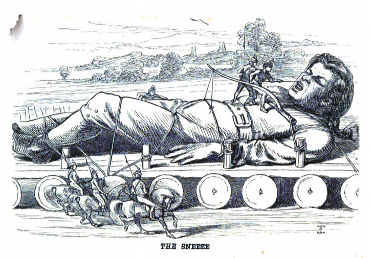This image shows the scene in Lilliput where Gulliver is transported into the city from the shore on a large gurney. A Lilliputian guard stuck his sword into Gulliver’s nose, tickling Gulliver causing him to sneeze, which in turn threw the guard off of Gulliver’s chest. Gulliver is shown tied onto the gurney, with two guards on Gulliver’s chest and three on horseback next to the gurney.