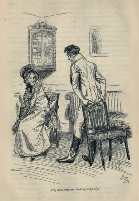 In this image we see Mrs. Elton inviting herself to Donwell Abbey, Mr. Knightley’s home. Mrs. Elton was eager to see into the finest houses around her, and as such invited herself and her party to go and see Donwell Abbey. Mr. Knightley agreed to show the house but would not let Mrs. Elton form the party. He said that she may invite her husband, but the rest of the invitations were to be his to extend. This scene occurs in chapter 42. The characters are shown in the traditional regency style. Mrs. Elton wears the regency style dress with an empire waist and a bonnet. Mr. Knightley wears a waistcoat and tailcoat. The regency period dated to the early nineteenth century (1811-1820) when George, Prince of Wales, later George IV (r. 1820-1830), reigned as regent for his mentally ill father, King George III (r. 1760-1820). The regency period is associated with the rise of neoclassicism in art and fashion.