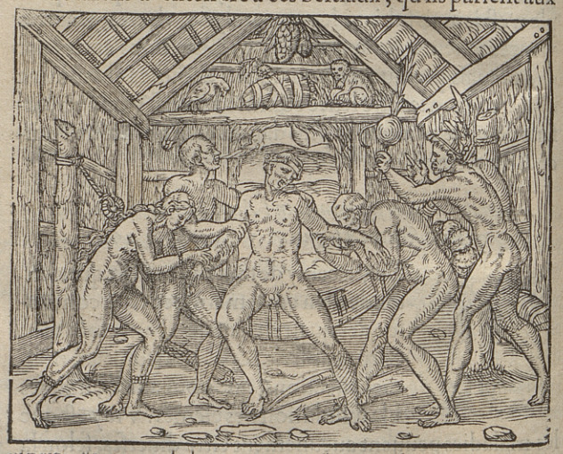 Inside a structure, a group of Indigenous people tend to a sick man. The man stands in the middle of the group with his arms outstretched to either side. Two people each hold one of the sick man’s arms, with the person on the right touching his lips to the man’s arm. Another man stands behind the afflicted man and holds him by the shoulders. To the right, a man wearing a feathered headdress holds a rattle or other ornament over the group. There is a hammock slung between two beams of the structure behind the group, above them a monkey and a bird sit on another beam and a bow and bundles of arrows lie on the ground. This image is identical to one found in Frankfurt, 1557.