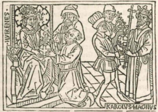 There are two women by the name of Irene that Boccaccio describes in his book. One was a empress of the Eastern Roman Empire. This engraving depicts Empress Irene as she is handed the globus cruciger. This engraving, however, is wrongly placed in the book as this engraving is meant to depict the other Irene that is discussed in the book. Irene was a Greek woman and a renowned, skillful painter during her time which Boccaccio believed to deserve praise as the arts were not a common practice of women. Boccaccio explains that Irene was the daughter of a man named Cratinus, who was also a painter (although much less renown).