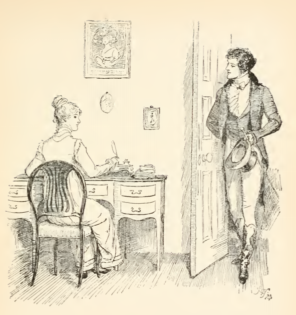 In this image Mr. Darcy visits Elizabeth at Hunsford. Mr. Darcy calls unexpectedly on Elizabeth at the Hunsford Parsonage. The conversation was awkward, and they struggled to find things to talk about. In their conversation Mr. Darcy implied that Mr. Bingley was unlikely to return to Netherfield from London. Elizabeth thought this call was odd, and Charlotte suggested that he only called because he was in love with her. This scene occurs in chapter 32. The characters are shown in the traditional regency style. Elizabeth wears the regency style dress with an empire waistline. Mr. Darcy wears a waistcoat and tailcoat with breeches and holds his top hat. The regency period dated to the early nineteenth century (1811-1820) when George, Prince of Wales, later George IV (r. 1820-1830), reigned as regent for his mentally ill father, King George III (r. 1760-1820). The regency period is associated with the rise of neoclassicism in art and fashion.