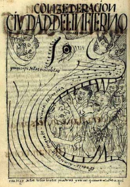 This image depicts sinners in the inferno of Hell. The author urges his readers to be good Christians so that they do not end up here. The image is a large jaguar head with sinners inside of its open mouth. There is a devil inside the mouth of the jaguar torturing the sinners, and there are also devils coming out of the ears and nostrils of the jaguar. There is a man inside the mouth who has a spear impaling his chest as torture. The rest of the people all have terrified expressions with tears running down their face. The caption written on the jaguar reads, príncipe de las tinieblas, el rrico auariento, engrato, luxuria, soberuia [The prince of darkness, the avaricious man, the ungrateful, lust, pride]. The caption at the bottom of the image reads, Castigo de los soberbiosos pecadores y rricos que no temen a Dios [Punishment of the proud sinners and rich men who do not fear God].