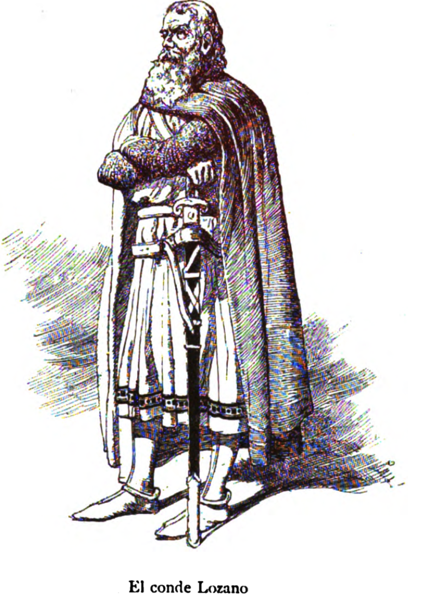 - The image is of the count Lozano. He is standing with his arms crossed against his chest; he has a long beard and hair. He is wearing robes with a cape and a belt at his waist. On his belt is a sheath where the tip of the sword is visible. He is also wearing pointed shoes.