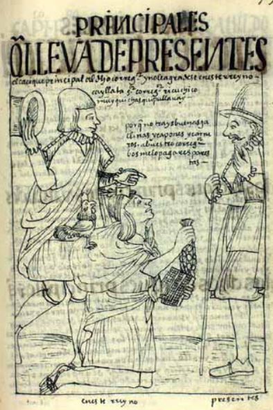 This image is illustrated in a chapter that discusses the descendants of the Inca and Andean nobles under Spanish colonial rule in Peru and their importance to a revived Andean society. This image depicts a cicaque [native lord] standing on the left side of the image taking his hat off to greet the Spanish corregidor [magistrate] on the right side of the image. There is a native commoner kneeling on the ground while looking up at the corregidor as he holds out his tribute (which appears to be a bad of money or food). There is dialogue written on the page which reads, cayllata senor corregidor ricuchicomuyqui chasquipullauay [Lord magistrate, I’ve come to give you these things, please receive it]. The corregidor replies, por que no trays buenas gallinas y capones y carneros a buestro corregidor, bos me lo pagarés por éstas [Why don’t you instead bring me good chickens, capons, and llamas?].