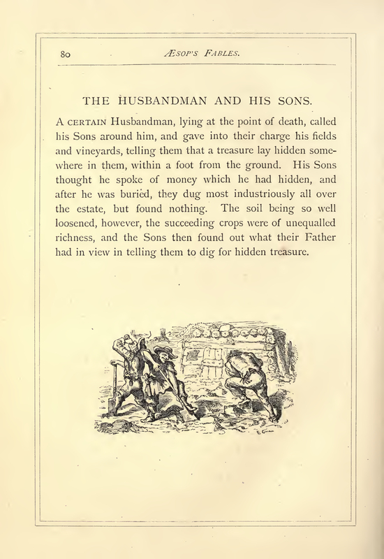 Three men are working in a field. The one on the far left is resting his foot on his shovel that is deep in the ground and is drinking from a small bottle. The man in the middle is digging into the dirt, its left foot on the shovel as he holds the shovel with both hands. The man to the right is facing with his back to the reader, pressing down on his shovel with his left foot and putting all his upper body weight onto it. In the background, a round-wood cabin lined with logs of wood is there.
