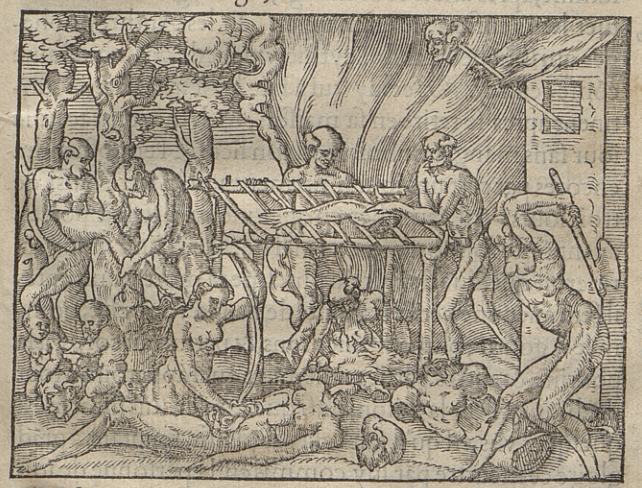 A group of Indigenous Brazilians engage in cannibalism. A man on the right uses a hatchet to dismember a human body. Several limbs and torsos lie scattered on the ground around the group. A wooden frame has been erected over a fire, and an arm sits on the frame to roast over the fire. There is a structure on the right, and a dismembered head mounted on a long pole sticks out the window. This image is identical to one found in Frankfurt, 1557.