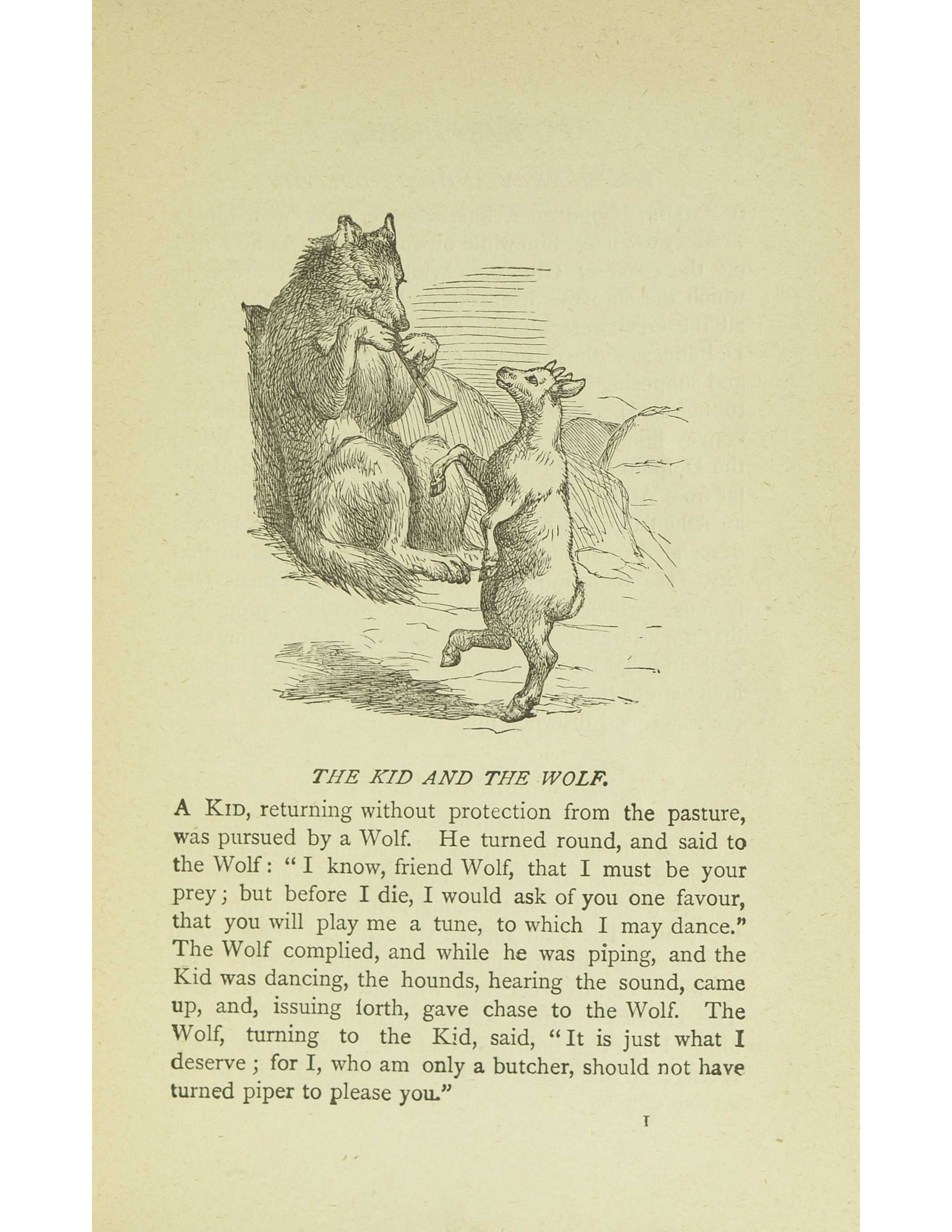 On the left side of the image, a wolf is sitting on its hind legs. It is resting its back against a large rock and is holding a small trumpet with its front paws to his snout. In front of the wolf, a kid is dancing around on its hind legs, its head turned in the direction of the wolf. The kid has a smile-like expression on its face as the wolf plays music and looks at the kid dancing.