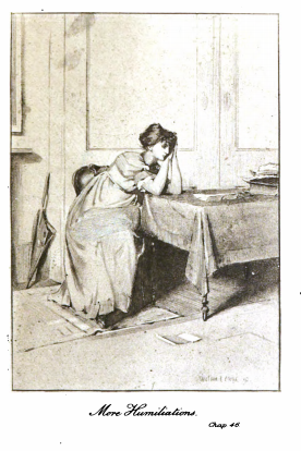 Here we see Georgiana Darcy, Mr. Darcy’s sister, sitting at a table in their home, Pemberley. Georgiana looks embarrassed, as she was reminded of when she was going to marry Mr. Wickham. She believed she loved Wickham, but he only wanted to marry her to get to Mr. Darcy’s wealth. Wickham felt he was entitled to Darcy’s wealth, because he was godson to Mr. Darcy’s father, and was left some money in his will. After using all of his inheritance, he wanted to gain more of the family wealth. Caroline Bingley brought up Mr. Wickham to try and embarrass Elizabeth, but it backfired, embarrassing Georgiana instead. Caroline wanted to embarrass Elizabeth because she wanted to marry Mr. Darcy herself. This scene occurred in chapter 45, noted beneath the title of the image. The characters are shown in the traditional regency style, with Georgiana wearing the regency style dress with an empire waist. Her hair is worn tied up, as was tradition for women after their coming out before the queen, signaling her entrance into society. The regency period dated to the early nineteenth century (1811-1820) when George, Prince of Wales, later George IV (r. 1820-1830), reigned as regent for his mentally ill father, King George III (r. 1760-1820). The regency period is associated with the rise of neoclassicism in art and fashion. The same image appears as an insert between pages 88 and 89 for the Dent 1893, 1894, 1895, 1896, and 1897 editions of Pride and Prejudice.