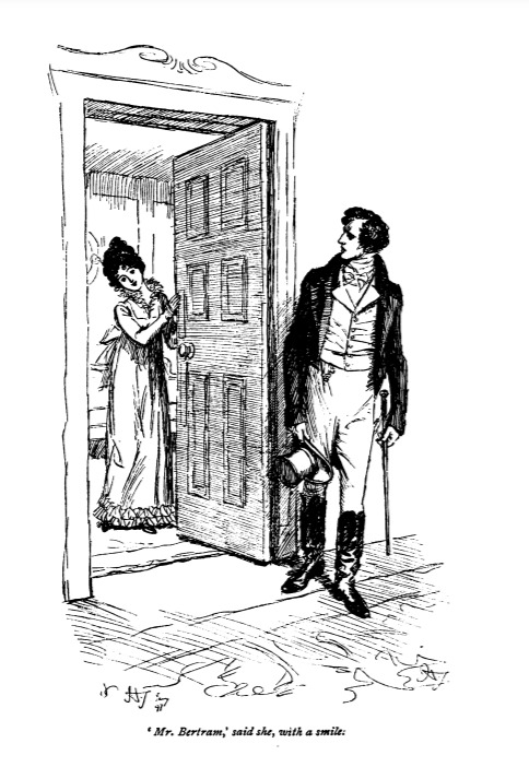 In this image Miss Crawford looks out the door at Edmund after he visited her in London. He went to visit her after hearing about the scandal between Mr. Crawford and Mary. Miss Crawford only seemed to show regret that the two had been caught, rather than renounce their behaviour. She also said that the scandal was Fanny’s fault because she refused to marry Mr. Crawford and so he felt the need to be satisfied elsewhere and turned to Maria with whom he had been flirting while at Mansfield. This upset Edmund, believing it to show her true colours. As he left, she stopped him, calling his name, smiling at him, trying to subdue him in a manner ill suited to the conversation that had passed. This scene occurs in chapter 47. The characters are shown in the traditional regency style. Miss Crawford wears a regency style dress with an empire waistline Edmund wears a waistcoat, and tailcoat, with breeches. In his hand he holds a top hat and a walking cane. The regency period dated to the early nineteenth century (1811-1820) when George, Prince of Wales, later George IV (r. 1820-1830), reigned as regent for his mentally ill father, King George III (r. 1760-1820). The regency period is associated with the rise of neoclassicism in art and fashion.