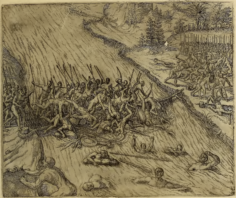 A group of Inca people braided ropes together to make a bridge across a river, in order to confront a rival group. However, as they were crossing, warriors on the other side of the river cut the ropes that anchored the bridge to the riverbank with a hatchet, sending the men crossing the bridge into the water. Several warriors are being carried downstream by the river current along with their weapons, although one man has managed to climb out of the water. Men in both armies are armed with bows, spears, and shields.