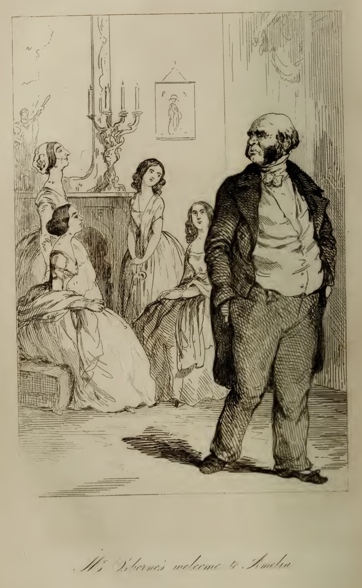 Jane and Maria Osborne are seated on two low chairs in front of the fireplace. Upon it are a very large mirror, a statue of a warrior, and a candelabra; to the side of the mirror hangs a small portrait. Amelia Sedley is standing between the sisters, looking uncomfortable and holding her hands clasped together. Miss Wirt is standing opposite Amelia, looking haughty. In the foreground of the image is Mr. Osborne, mostly turned away from the others as he walks away with a scowl on his face. Below the illustration is printed in cursive its title, Mr. Osborne’s welcome to Amelia.