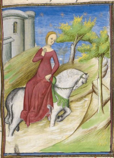 This illumination depicts Cloelia, a young Roman woman, riding a horse through a deep river. Boccaccio explains that Cloelia was given to a foreign king as a hostage, and when she escaped, she took many other hostages with her back to Rome. While escaping, she came across a river that was too treacherous to pass. She found a horse, and despite never having ridden one, she got herself and the other women across safely by means of this horse.