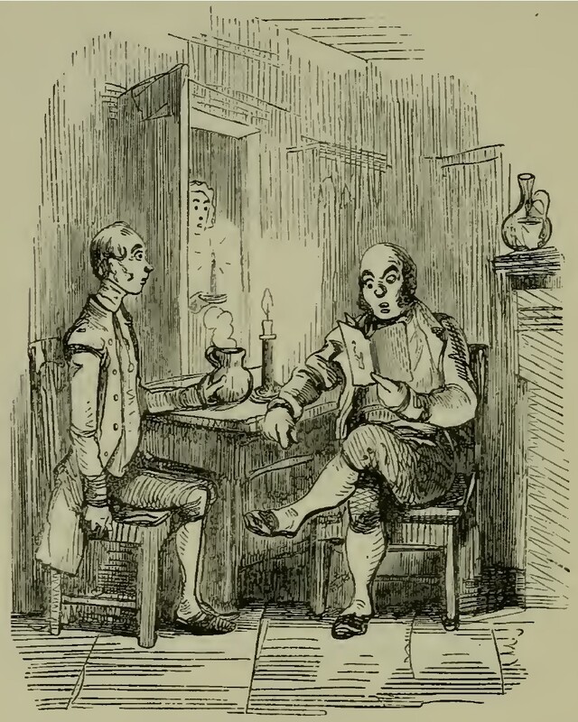 - Mr. Bowls sits in a chair at the kitchen table, reading Fire and the Frying Pan aloud to his assistant, who sits opposite him, holding onto a jug. Through the door in the background, Mrs. Firkin is entering, holding a candle in front of her.