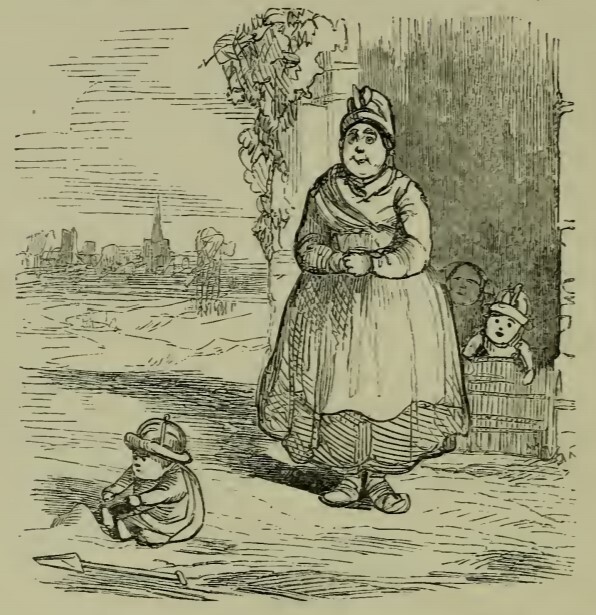 The garden’s wife stands outside her ivy-covered house, with the cityscape in the distant background. In front of her is young Rawdon Crawley, for whom she is the nurse, making mud pies in the dirt. Behind a low gate in the doorway of the house are two other young boys, either her own sons or other children over whom she is watching.