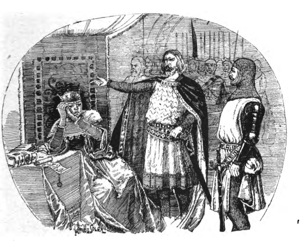In this image the lady Urraca is sitting in front of El Cid and his soldier. She is wearing dress with a crown on. She has her elbow on the desk with books and papers. She also has her eyes closed. El Cid is the one who has his arm outstretched in front of him. He has a beard and moustache. He has his armour on with a cloak. At his waist there is sheathed sword. Next to El Cid is his soldier. He is wearing a tunic with chainmail underneath it. He also has a sheathed sword at his waist. Behind the three main focuses of the image there is a blur of people. The blur of people seem to be a mixture of soldiers and the people.