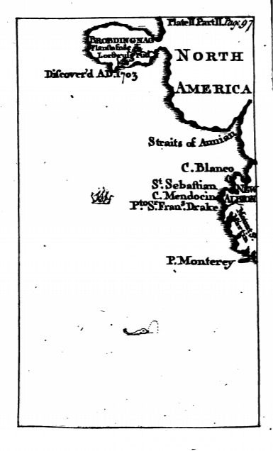 The image depicts the fictional land of Brobdingnag, off of North America. The cities of Flagnlamic and Lorbrulgrud are shown in Brobdingnag. Underneath Brobdingnag reads Discovered AD. 1703. The bottom half of the map includes New Albion. A ‘man-of-war ship is shown off the coast of New England, and a dolphin is near the bottom of the image. The same map is featured in several other editions of the text, including those in other languages.