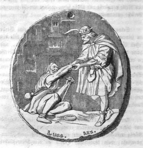 Here we see the seal of the King of Luggnag. The seal shows the king helping a lame beggar to stand up. The beggar is lying on the ground holding a cane. A dish is on the ground in front of him. The King stands in front of the beggar, extending his arm to help the beggar. Along the bottom of the seal is the phrase Lugg. Rex., meaning King of Luggnagg. The seal would be used when sending official letters. The seal appears when Gulliver presents a letter with this seal to a customs official in Japan, asking the Japanese to grant Gulliver passage to Europe. The same image appears in the 1843 Krabbe edition.