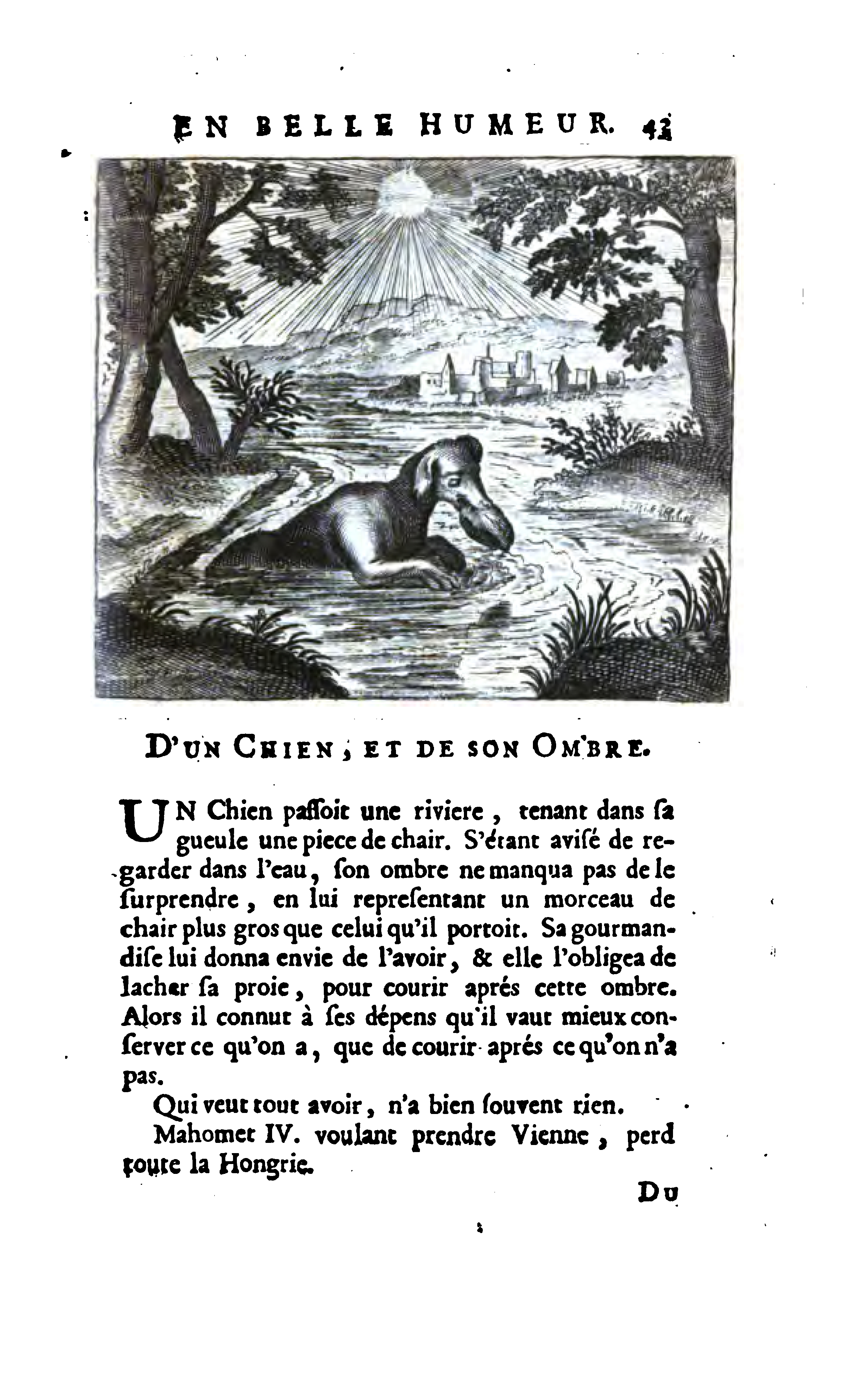 There is dog swimming in the river and the dog has a fish in his mouth. The majority of the image is the river running through the town and there are trees on either side of the river. In the vast distance there are houses and behind that a mountain range. ON top of the image, there is a sun rising and the rays are shining through the mountain range.