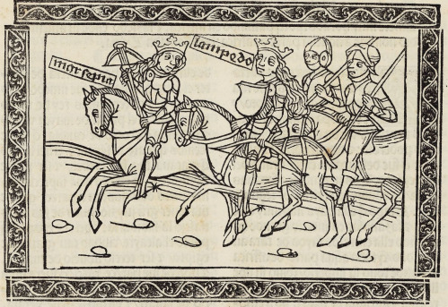 This engraving depicts the queens of the Amazons, Martesia and Lampedo. The Amazons, as described by Boccaccio, were a group of widows who decided to take up arms and fight to avenge their husbands’ deaths. They began dedicating their lives to training in riding horse-back, archery, and other military skills. The Amazons elected Lampedo and Martesia to be their queens. Lampedo is depicted with a bow and arrow in her left hand as she rides her horse, with her name engraved beside her head. Martesia is illustrated looking back at Lampedo with a sword in her hand. Her name is engraved to the right of her sword. The women riding behind them are other Amazon women.