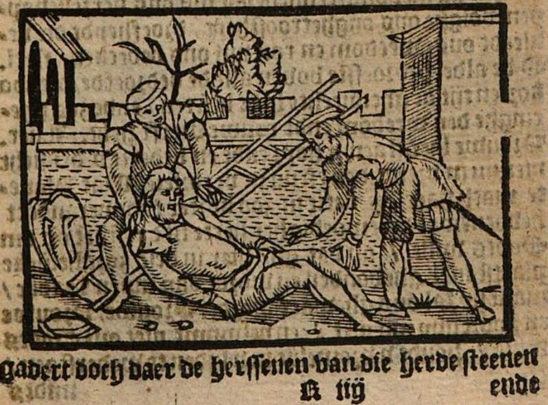 Calisto hears Sosia shouting in the street, and he climbs the garden wall to see the cause of the commotion. By the time he reaches the top of the wall, Sosia has already scared off Centurio’s men. Nonetheless, Calisto starts to descend the ladder on the outside of the wall, but he falls to his death. In this illustration, Calisto is seen lying lifeless on the ground. His hat has fallen off and is now in the bottom left corner of the illustration. Sosia and Tristan are trying to rouse him, but death has already taken hold. In the background, we can see a shield (to the left) and, leaning against the wall, the ladder that proved to be Calisto’s demise.
