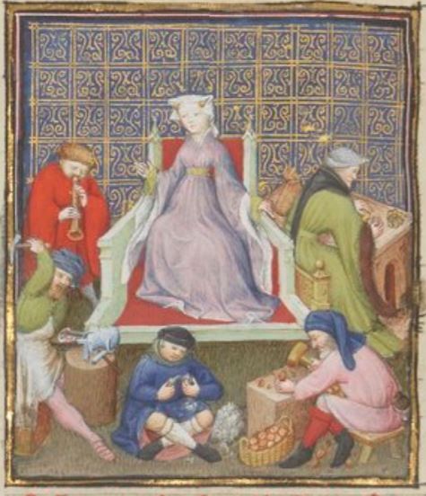 This illumination depicts the goddess Minerva sitting in the centre of the image on a throne. The people surrounding her represent the inventions and discoveries Minerva introduced to the world. There is a man on the left side of the image playing a flute, and another man creating iron weapons, which are both creations of Minerva. There is a person sitting on the ground who is spinning wool with their fingers, which is something Minerva discovered and showed humans how to do. There is also someone crushing olives with a hammer in order to create olive oil, which is another discovery of Minerva’s. There is a man sitting at a desk on the right side of the image who appears to be counting objects, which would signify Minerva’s discovery of numbers,