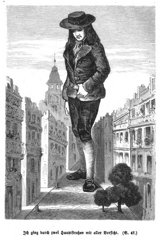 Here we see Gulliver walking through the streets of Mildendo, the capital city of Lilliput. Gulliver turns sideways to squeeze through the streets. Gulliver stands taller than most of the buildings. Lilliputians look out their windows at Gulliver. The streets are empty because the Lilliputians were told by officials to remain indoors while Gulliver explored the city.
