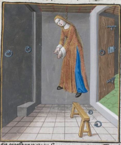 This illustration depicts the freedwoman, Epicharis, committing suicide by hanging. Epicharis had heard the details of the conspiracy to assassinate emperor Nero, and when she put her faith in the wrong person, they told emperor Nero that she was involved in the plan. They tortured her many times; however, she did not reveal the names of anyone involved in the conspiracy. Afraid that if she was tortured any further, she would reveal the names of the conspirators as her strength was depleting. To avoid this from happening, she hung herself in her prison cell.