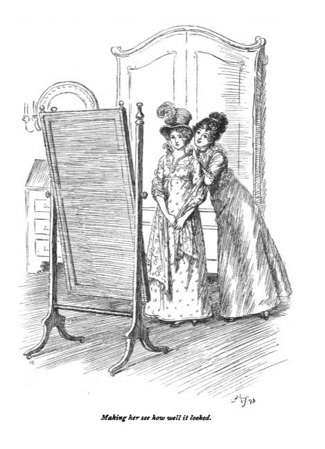 Here we see Miss Crawford giving Fanny a necklace on which to wear the cross William brought for her. William brought Fanny an amber cross from Sicily, and Fanny needed a gold chain to put it on. This scene mirrors one from Austen’s life, as Jane Austen’s brother, Charles, brought her an amber cross when he was serving in the navy in 1801. Austen records this in a letter to her sister, Cassandra, written on 27 May 1801. Charles also gave an amber cross to Cassandra. The chain was bought by Mr. Crawford, and he asked Miss Crawford to give it to Fanny, knowing she would not accept it from him. Fanny had gone to the parsonage to ask Miss Crawford her advice on what to wear to the ball. When she returned to Mansfield Park Edmund gave her a chain that he had bought for her. After hearing that Miss Crawford had already given her a chain, Edmund fell deeper in love with her. This scene occurs in chapter 26. The characters are shown in the traditional regency style. Fanny and Miss Crawford wear regency style dresses with empire waists. Miss Crawford puts the necklace on Fanny, who stands in front of the mirror. The regency period dated to the early nineteenth century (1811-1820) when George, Prince of Wales, later George IV (r. 1820-1830), reigned as regent for his mentally ill father, King George III (r. 1760-1820). The regency period is associated with the rise of neoclassicism in art and fashion.