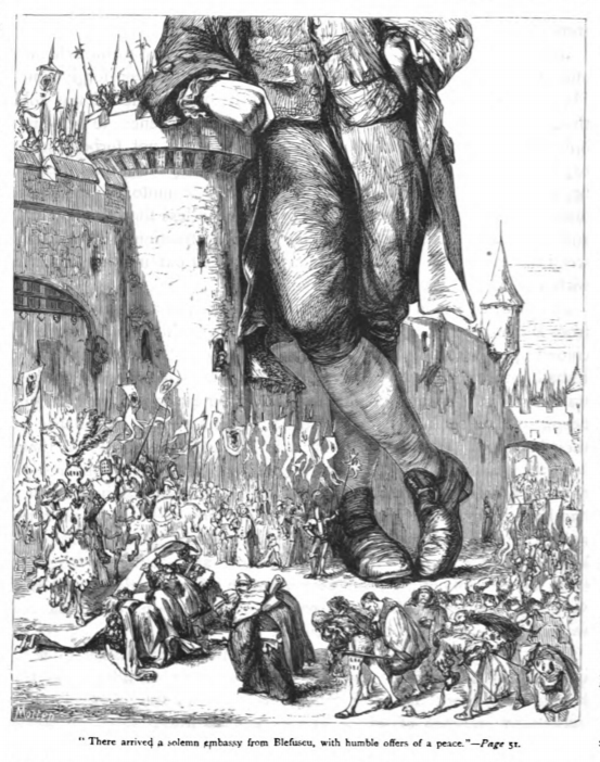 Following the defeat of Blefuscu in the war, Blefuscudian diplomats arrived on Lilliput to write a treaty for peace. The embassy is seen arriving with their heads down in the harbour of Lilliput. Gulliver stands, leaning against the lighthouse. A crowd of Lilliputians line the road holding banners with the Lilliputian crest on it.