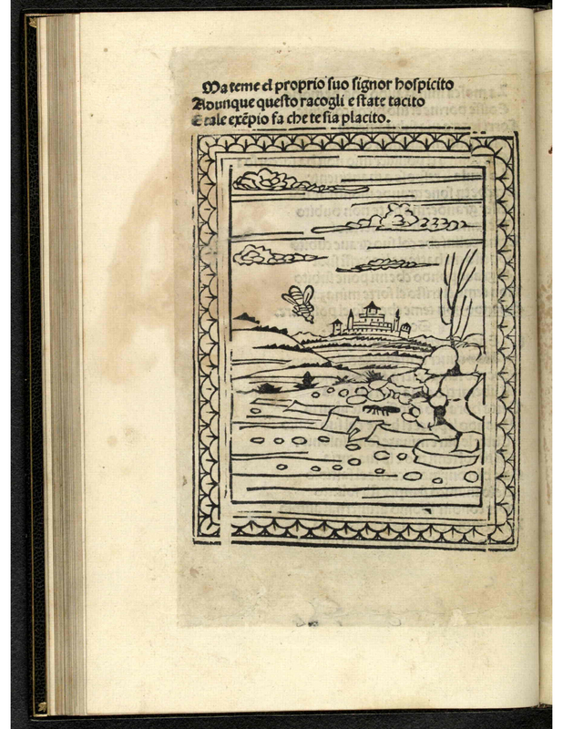 - In the distance, a town is visible. A bee is flying in the sky, an ant is visible on the ground near the stump of rocks. A few clouds decorate the sky. Trees are in the hills far away.