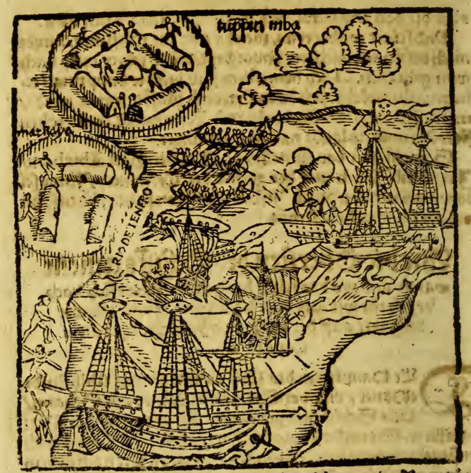 [Europeans and Tupinambá people engage in a naval battle]